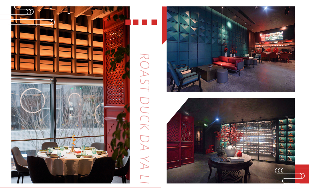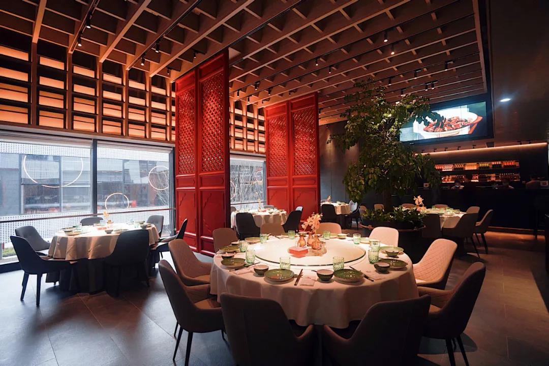 二楼的空间,红色元素偏多,挑高的设计,绿植的陪衬,让身处其中的食客像是踱步在故宫的屋檐下。